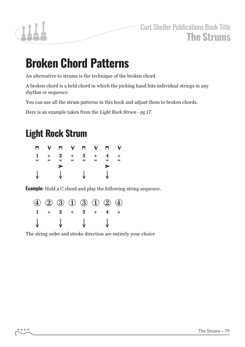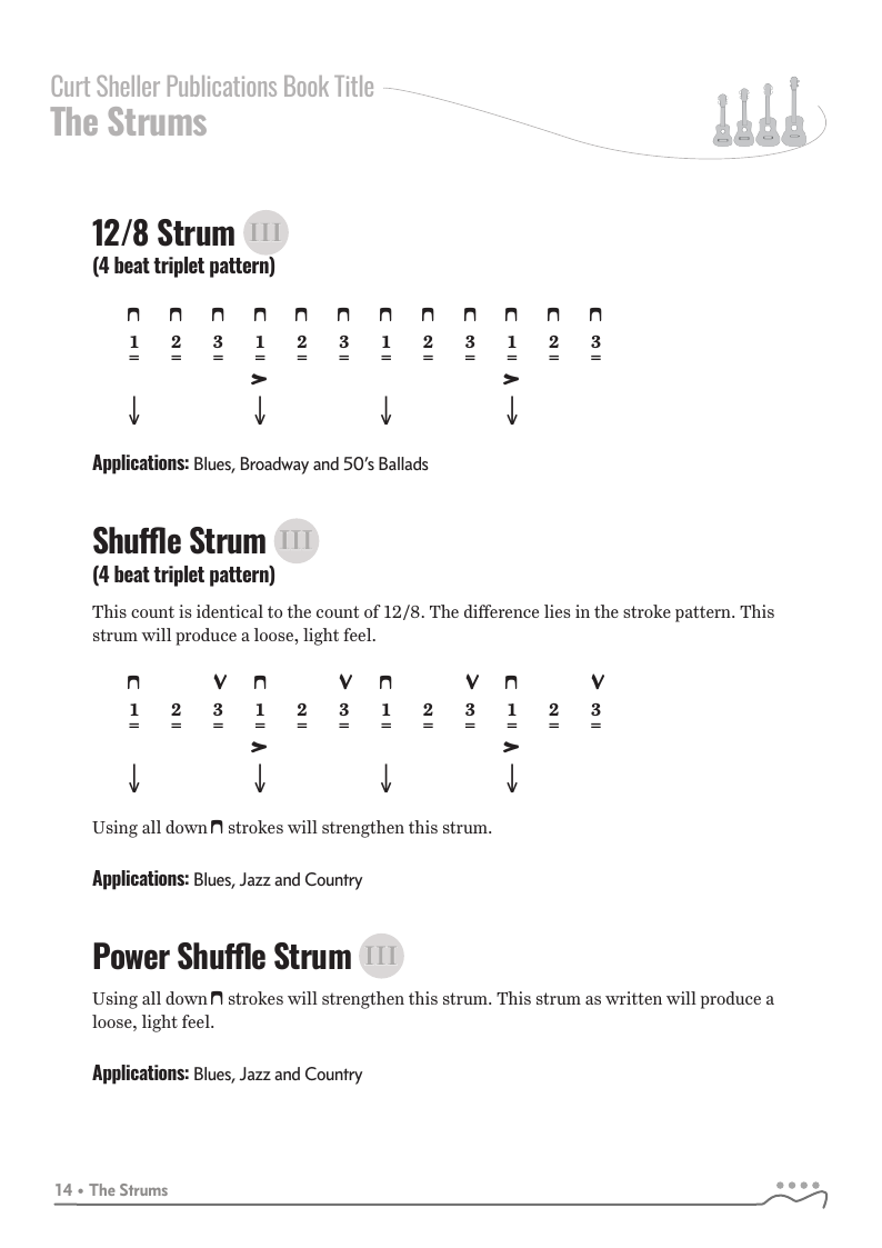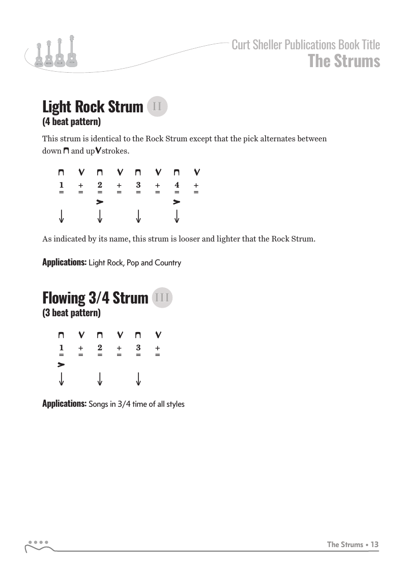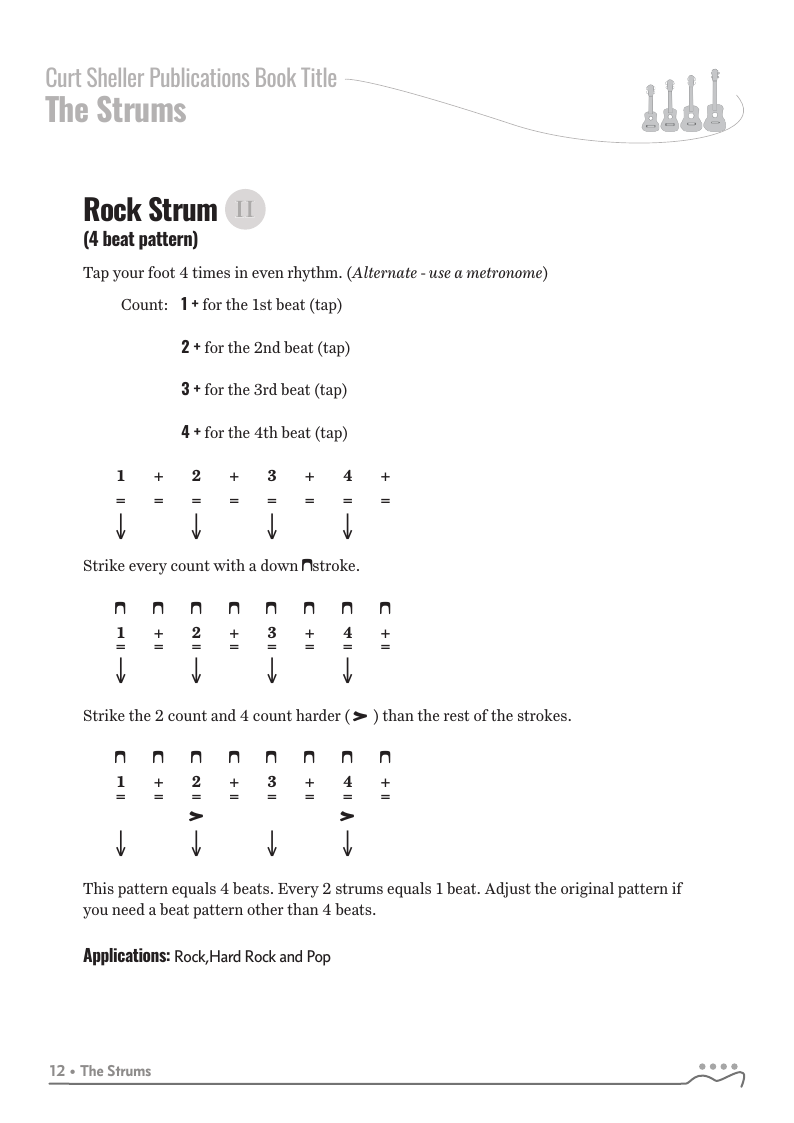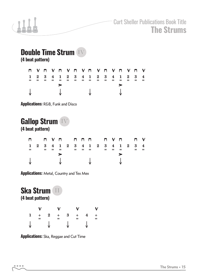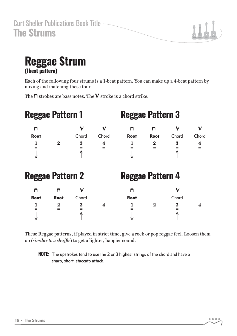 Strums covered include: Quarter Note, Sustain, Rock, Light Rock, 12/8, Shuffle, Power Shuffle, Double Time, Gallop, Flowing 3/4, Ska, Bass Note Patterns, 3/4, Reggae and Broken Patterns.