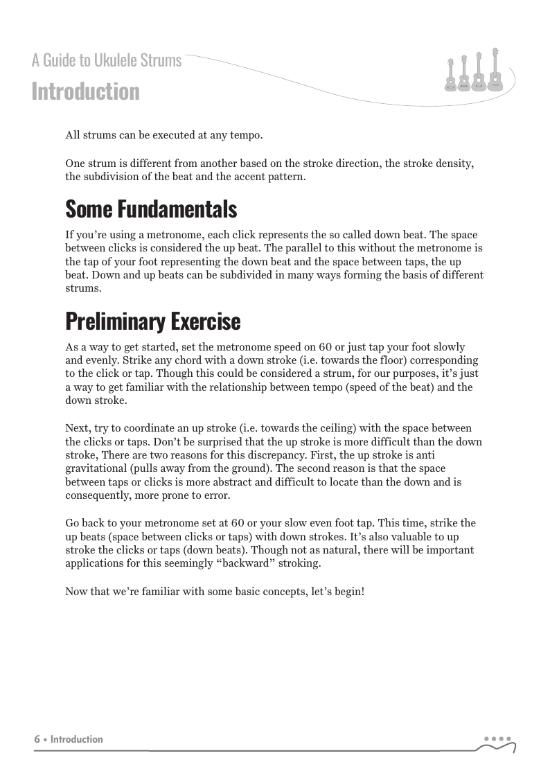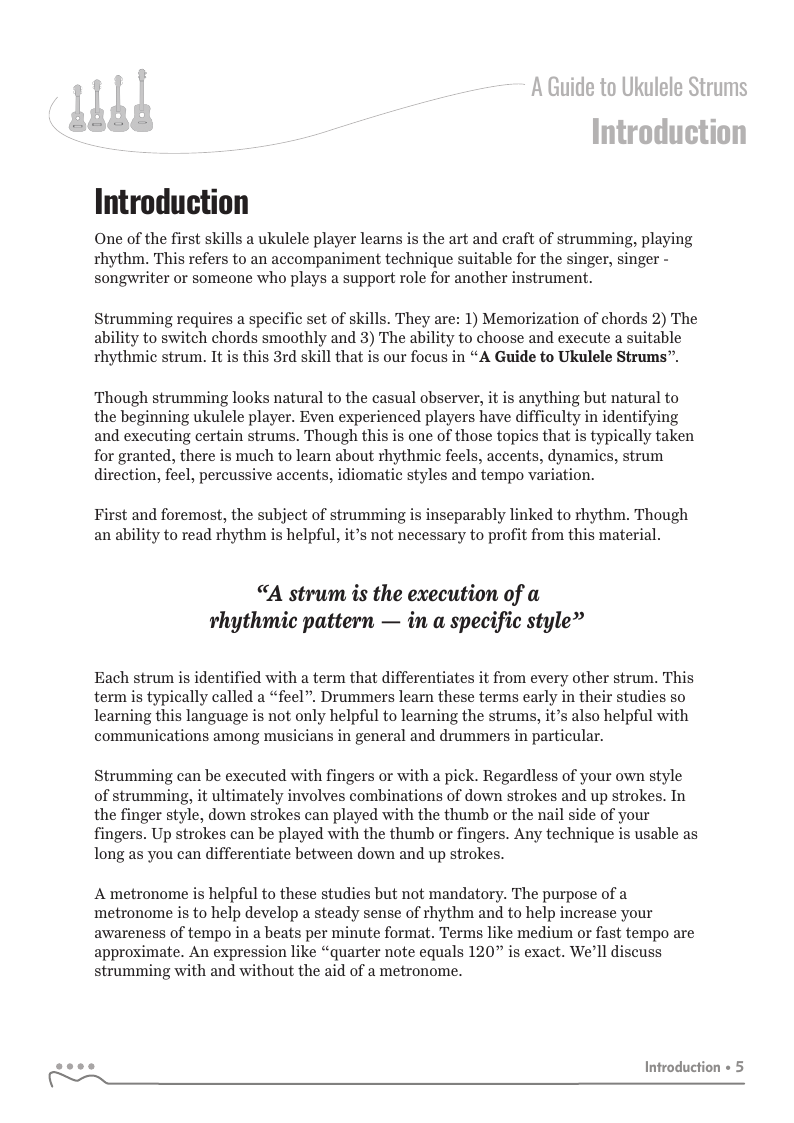 Though strumming looks natural to the casual observer, it is anything but natural to the beginning ukulele player. Even experienced players have difficulty in identifying and executing certain strums. Though this is one of those topics that is typically taken for granted, there is much to learn about rhythmic feels, accents, dynamics, strum direction, feel, percussive accents, idiomatic styles and tempo variation.