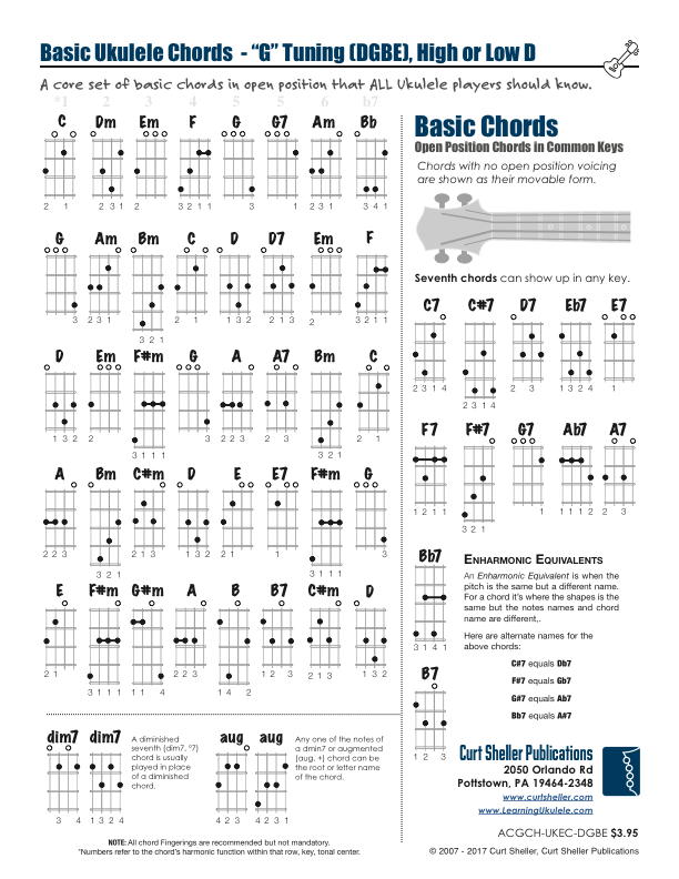 This chord book is the perfect size for every ukulele gig bag or case and a great addition to you music book library. Ukulele Chords covers basic open position and basic movable form chords. From these two chord categories a variety of songs and styles can be played. Seventh chords, Major Sevenths, Minor Sevenths, Diminished, Augmented chords sus and add chords. Tunings: G with low or high D - (DGBE or dGBE).