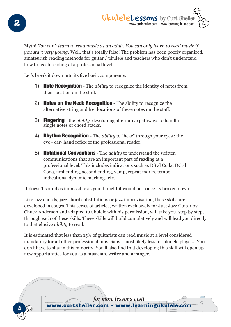 Myth! You can’t learn to read music as an adult. You can only learn to read music if you start very young. Well, that’s totally false! The problem has been poorly organized, amateurish reading methods for guitar / ukulele and teachers who don’t understand how to teach reading at a professional level.