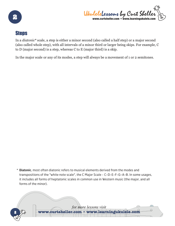 Two half steps are a whole step or whole tone ( W or 2 ). This can also be referred to as two steps ( 2 ). For guitar or ukulele this is two frets higher or lower along the same string.