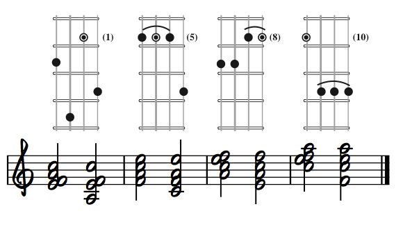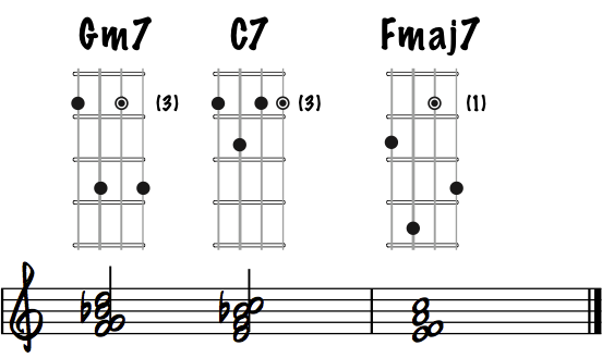 The maj7 chord is one of your Big Six Core Chords and Fmaj7 is the notes: F A C E. Actually pretty easy one to memorize as it a real word that we all know and is the spaces of the five line music staff in the treble or G clef. When the notes of the chord are shown on standard music notation you can easily see where the dissonance happens. Here are the four chords shown in both high and log G, C tuning.