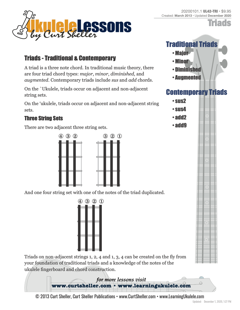 On the ukulele, triads occur on adjacent and non-adjacent three string sets.