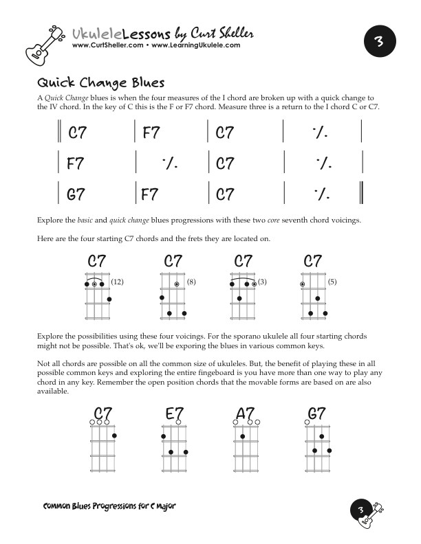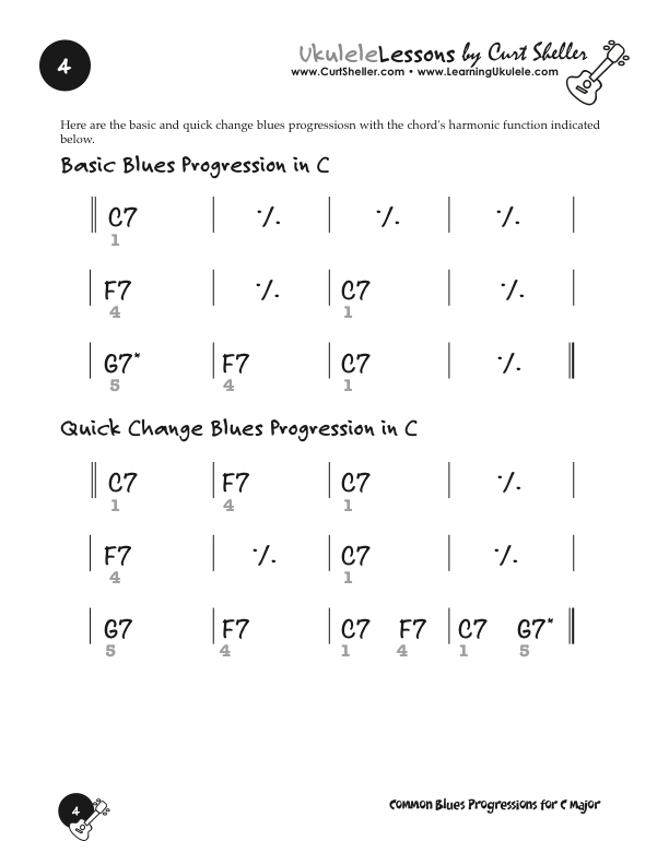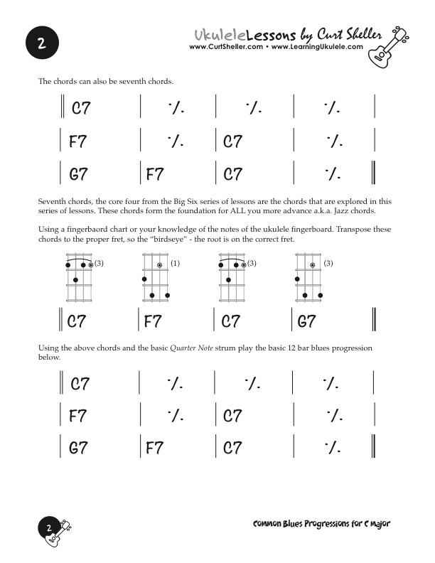 Basic and Quick Change blues chord progressions in the key of C major using the core 7th chords from the Big Six series of lessons. This is a great way to explore this core chord in various keys. These are the two most common blues progressions used in traditional and contemporary music.