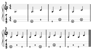 Any combination of quarter notes (one beat), half notes (two beats), dotted half notes (one and one-half beats) and whole notes (four beats) that all add to the number of beats required for the measure/bar can be used to create the fingerpicking pattern.