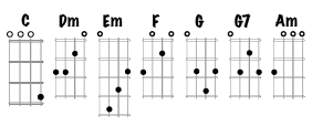 The basic first chords most players learn. There are the chords in the first, second, third, and fourth frets of the ukulele and include at least one open string.