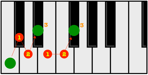 • Then count up Three black and white keys (not including the one you are currently on). This is the third and last note of the chord.