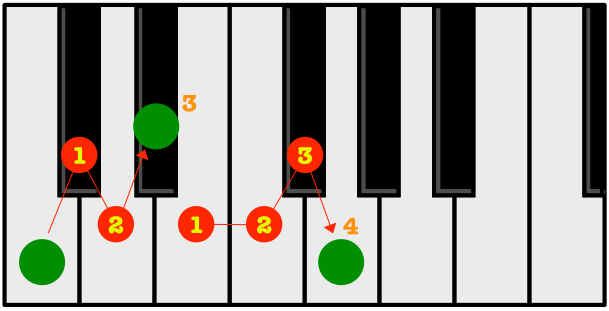 • Count up Four black and white keys (not including the one you are currently on). This is the second note of the chord.