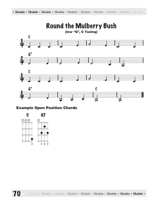 The following songs can be played in open position using the natural notes covered in the previous lessons of this primer. These songs do not use any signatures, no time or key signature is shown. All songs are played with a quarter note taking one beat. Signatures - both Time Signatures and Key Signatures are covered in book 1 of Ukulele - Reading Music. Playing the rhythms correctly insures that you are playing in the proper time signature.