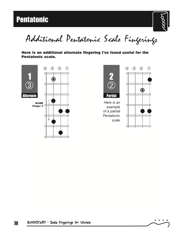 The Pentatonic or Major Pentatonic is one of six essential scales for ALL ukulele players. One octave scale fingering solutions covering strings four and three using any finger. Pentatonic (Major Pentatonic) scale chords are covered in all keys.