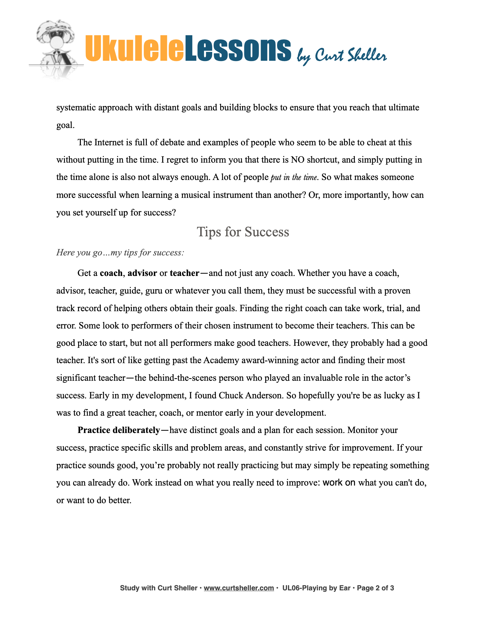 Get a Coach, Advisor or Teacher — and not just any anybody. Whether you have a coach, advisor, teacher, kumu, guide, guru or whatever you call them, they must be successful with a proven track record of helping others obtain their goals — not simply good players. Finding the right coach can take work and some trial and error. Some look to performers of their chosen instrument to become their teachers. This can be a good place to start, but not all performers make good teachers. However, they probably had a good teacher. It's somewhat like getting past the Academy award-winning actor and finding their most significant teacher — the behind-the-scenes person who played an invaluable role in the actor's success. Early in my development, I found Chuck Anderson. So, hopefully you're being as lucky as I was to find a great teacher, coach, or mentor early in your development.