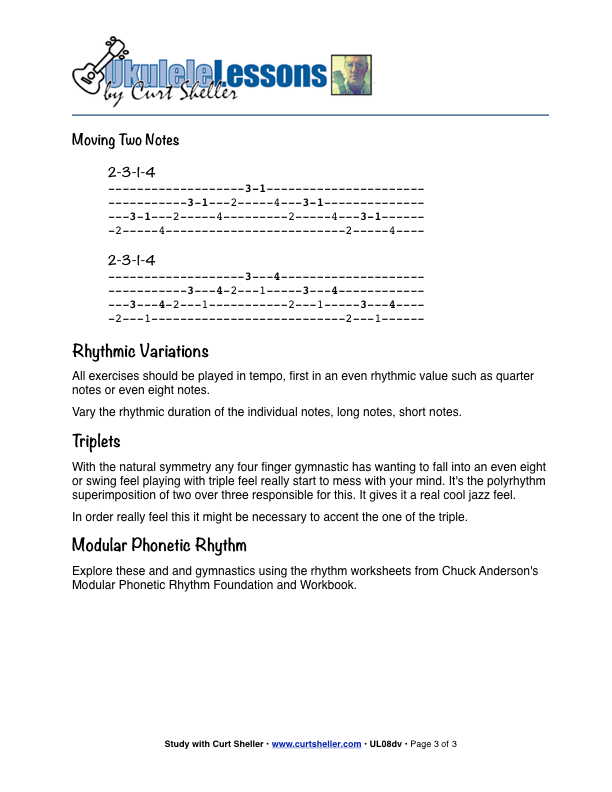 Building on the single note, 1, 2, 3, and 4 finger basic gymnastics. Now with a repeating note or two. This series of lessons, although the examples are shown for ukulele, are appropriate for any fretted string instrument like guitar, banjo, or mandolin.