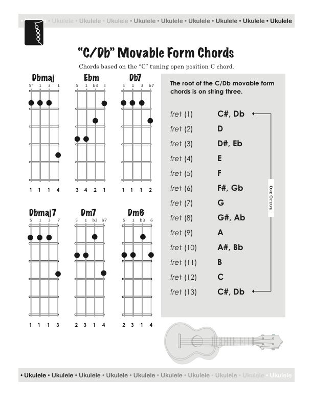 The "C/Db Movable Form Ukulele Chords", based on the open position "C, Cm, and C7" chords allow you to transpose these to any key. The movable form chords are the next step after learning the core open position chords.
