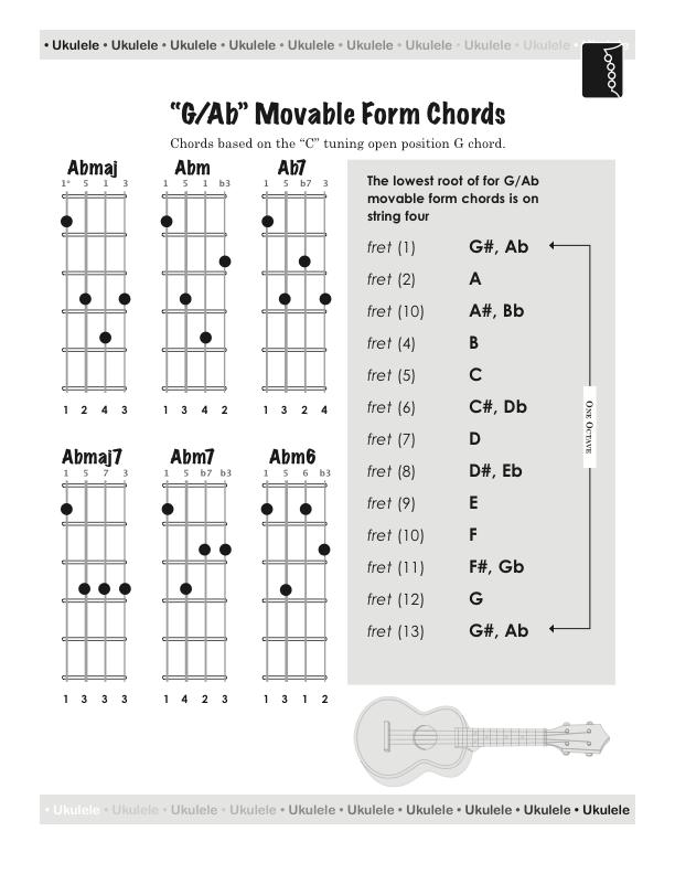 The "G/Ab Movable Form Ukulele Chords", based on the open position "G, Gm, and G7" chords allow you to transpose these to any key. The movable form chords are the next step after learning the core open position chords.