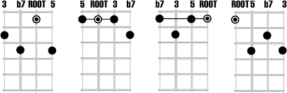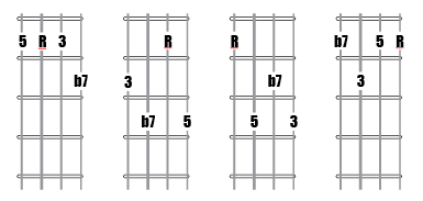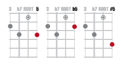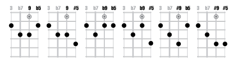 Memorize the locations of the Root, 3, 5 and b7 chord tones of these four chords. The b7 is typically not altered or changed as it is a critical tone of the chords and with the third gives a seventh chords its characteristic color and sound.