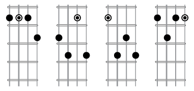 For ukulele I use the above four F7 chords and for guitar I use these as C7 as well as additional sets as there are quite a few more possible sets of fours strings on guitar.