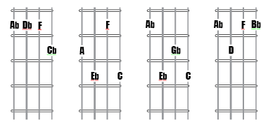 In C tuning, low or high G the chords shown at fret (1) are: Db7, F7, Ab7 and Bb7.