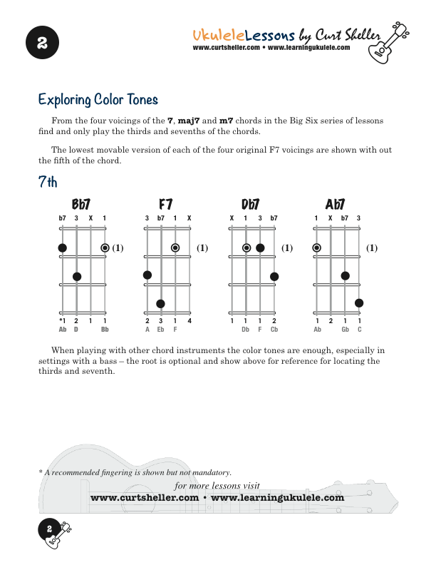 The Big Six Core Chords - Level I: "F7" is created from the "1 3 5 b7" of the major scale, based on the root of the chord. For "F7" the chord tones are: F A C Eb. This lesson introduces the four "F7" voicings on the string set, strings 1, 2. 3, and 4. The Chords are shown for C Tuning, Low and High G.