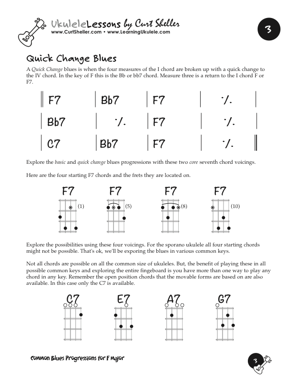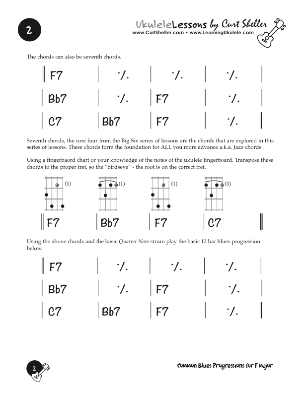 Basic and Quick Change blues chord progressions in the key of F major using the core 7th chords from the Big Six series of lessons. This is great way to explore this core chord in various keys.