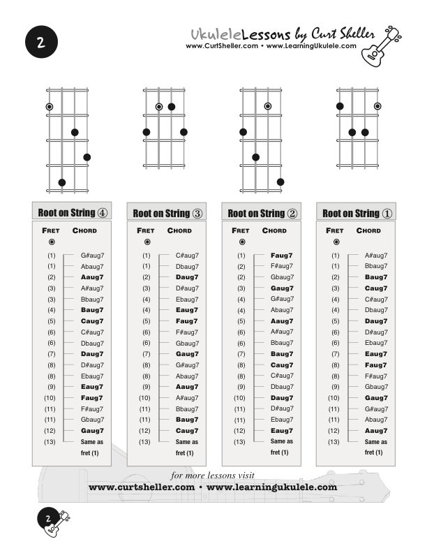 The Big Six Core Chords, LevelI - Faug7, four voicings. Faug7* is a 1 3 5# b7 of the major scale, based on the root of the chord.