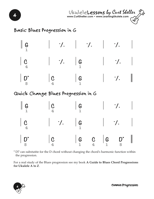 Basic and Quick Change blues chord progressions in the key of G major using the core 7th chords from the Big Six series of lessons. This is great way to explore this core chord in various keys. These are the two most common blues progressions used in traditional and contemporary music.