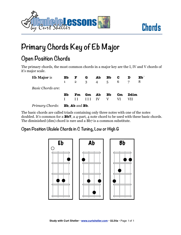 The primary chords for any major key are the I, IV and V chords of its corresponding major scale. For Eb Major, the primary chords are: Eb, Ab, Bb and Bb7. From the primary and secondary chords of a major key, countless songs and chords progressions can be played.