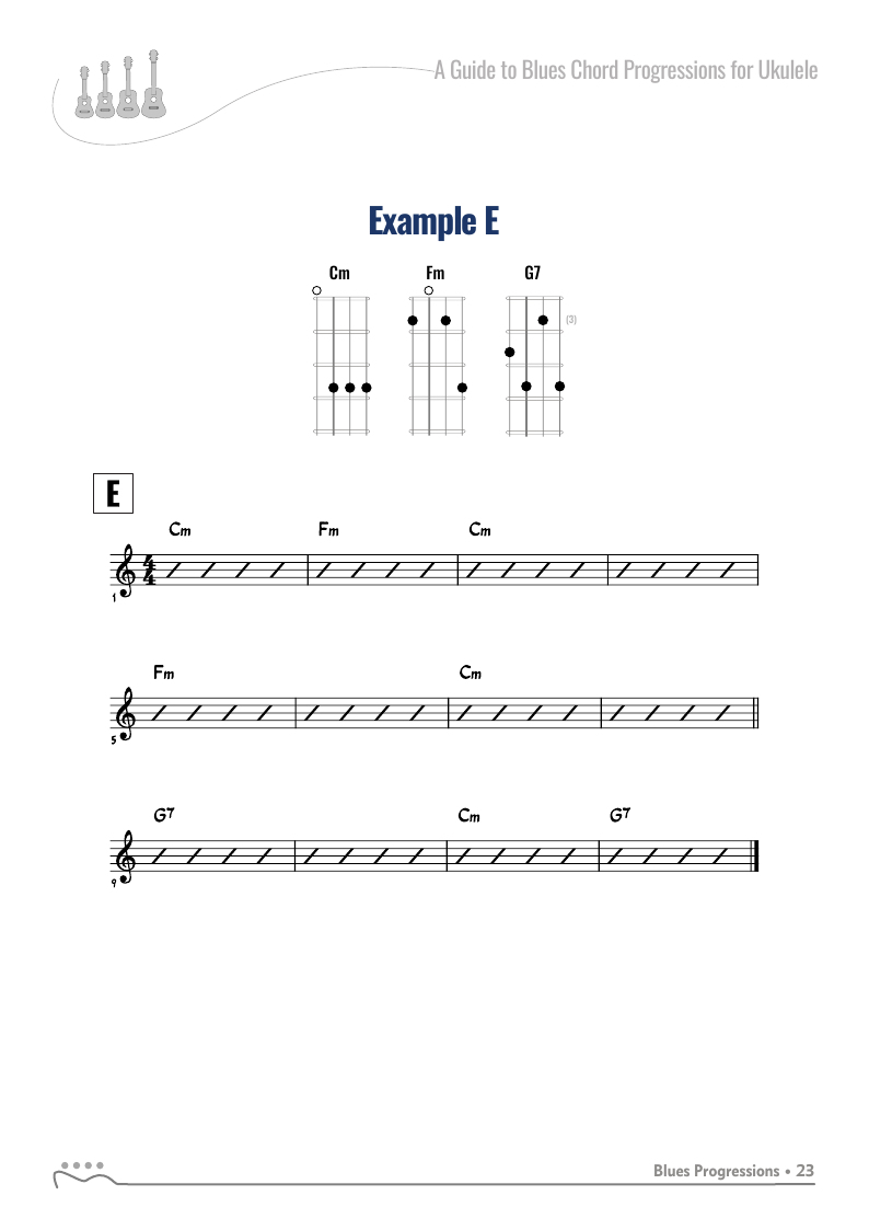 Example E blues progression from the book "A Guide To Blues Chord Progressions For Ukulele A To Z" - C Tuning by Curt Sheller.