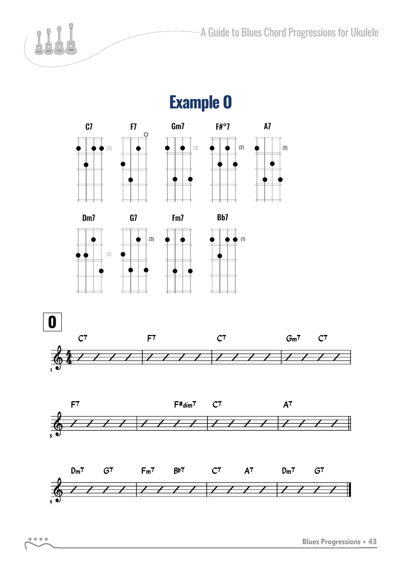 Example O blues progression from the book "A Guide To Blues Chord Progressions For Ukulele A To Z" - C Tuning by Curt Sheller.
