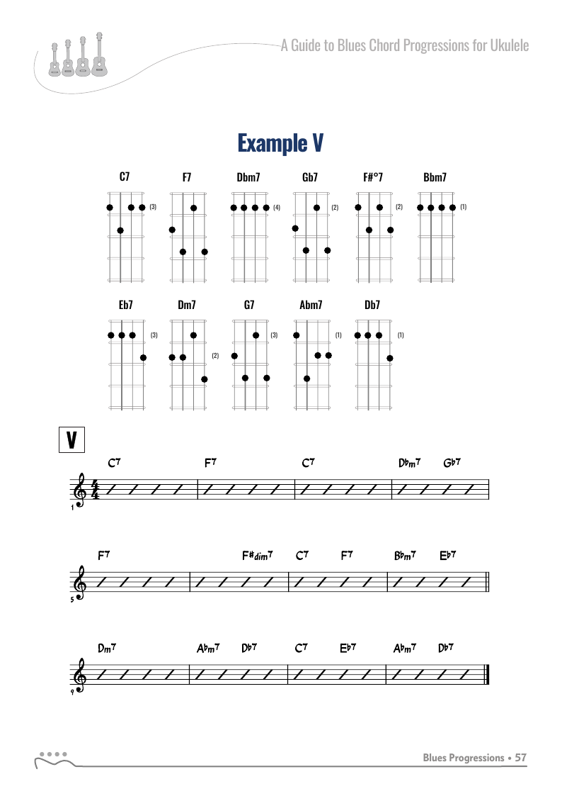 Example V blues progression from the book "A Guide To Blues Chord Progressions For Ukulele A To Z" - C Tuning by Curt Sheller. The blues progressions and all their possible harmonic variations are great for exploring chords and chord substitution principles.monic variations is a great progression for exploring chords and chord substitution principles.