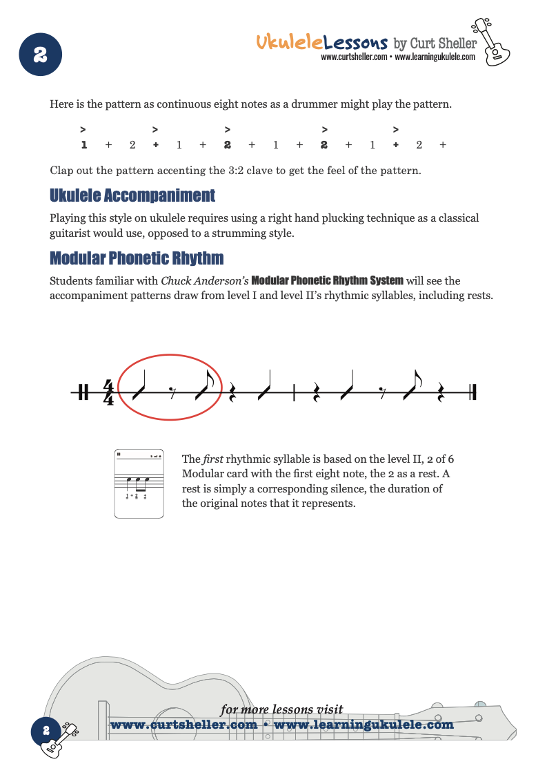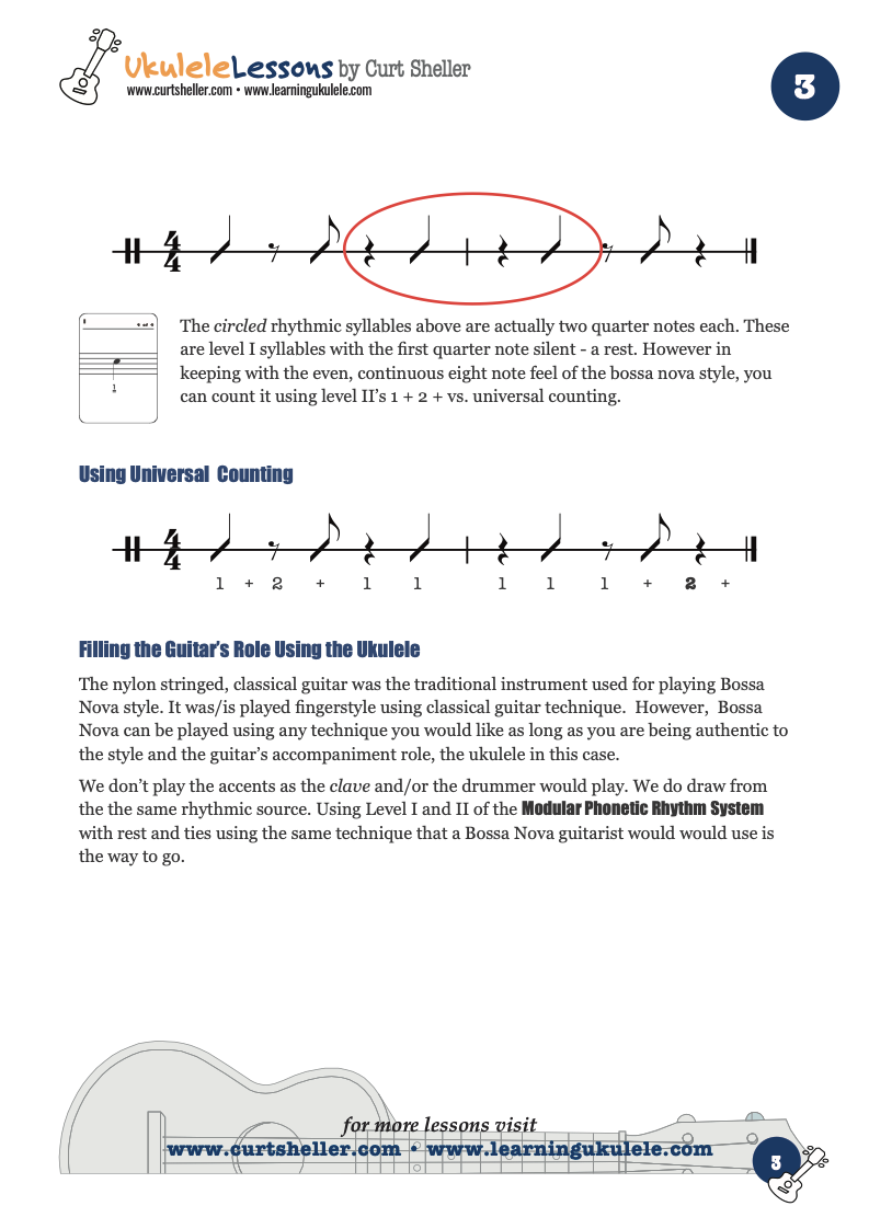 Bossa Nova has typically been performed on nylon stringed classical guitars plucking With the fingers as opposed to a pick. This is makes the ukulele a great instrument for performing Bossa Nova. In is purest form it is vocals and unaccompanied guitar. At its core the Bossa Nova rhythm is based on Samba. Samba’s emphasis on the second beat carries through the bossa nova pattern and at times is often notated in 2/4. A samba, unlike the bossa nova has a distant dance pattern associated with the style.