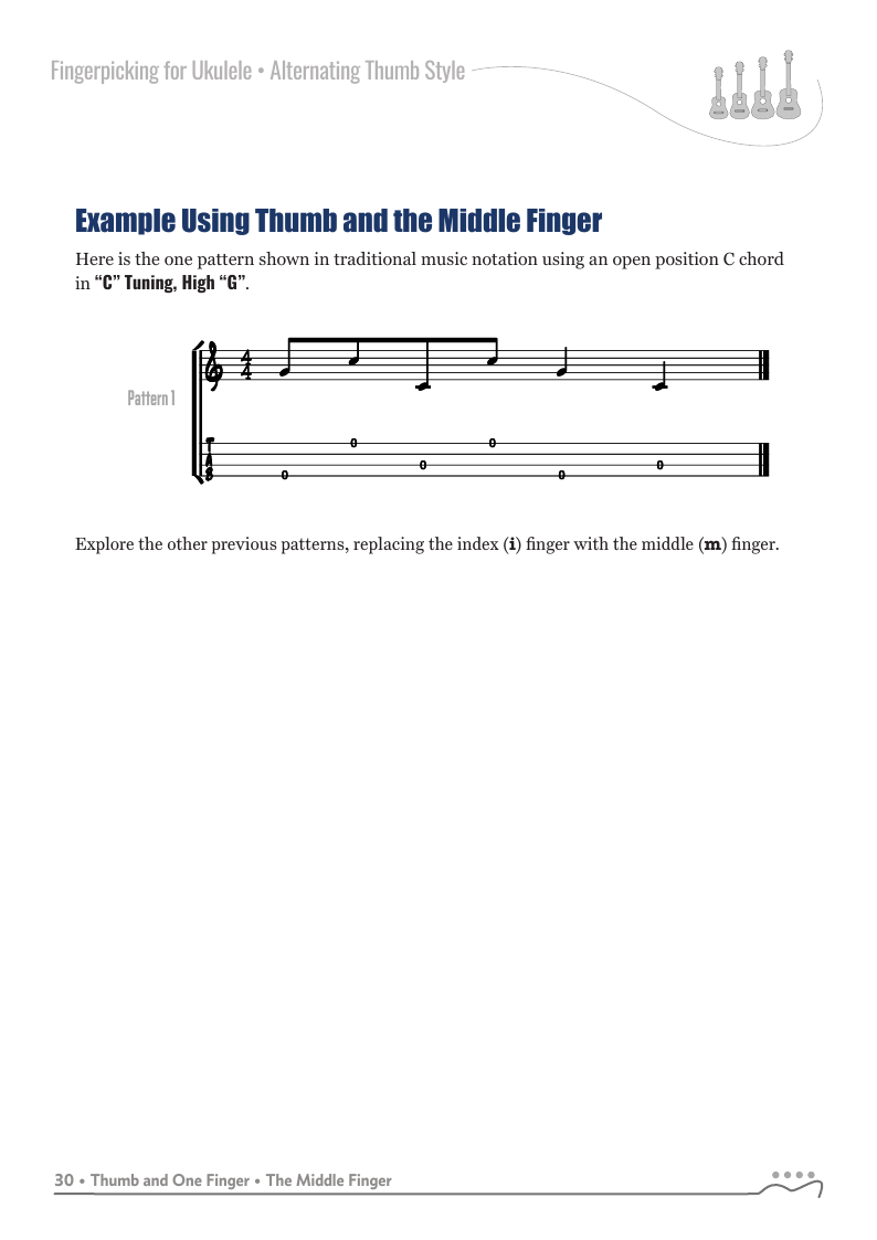 Fingerpicking for Ukulele - Alternating Thumb Style, 2nd Edition is an new expanded edition which focuses on the alternating thumb fingerpicking style through a series of graduated lessons-chapters incorporating your index and middle fingers with the alternating thumb.