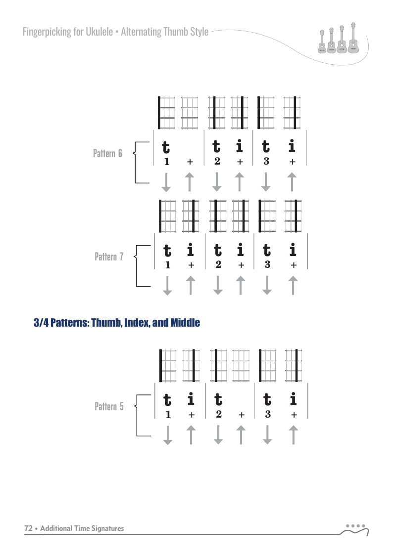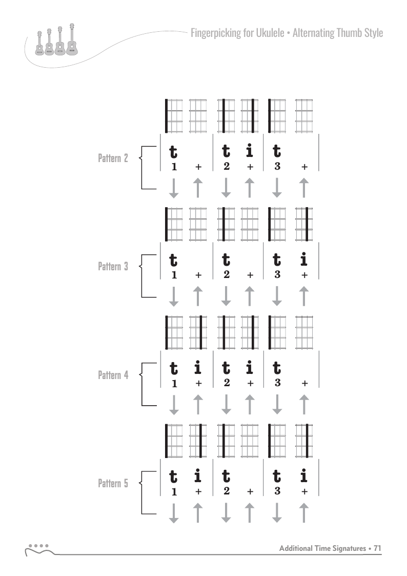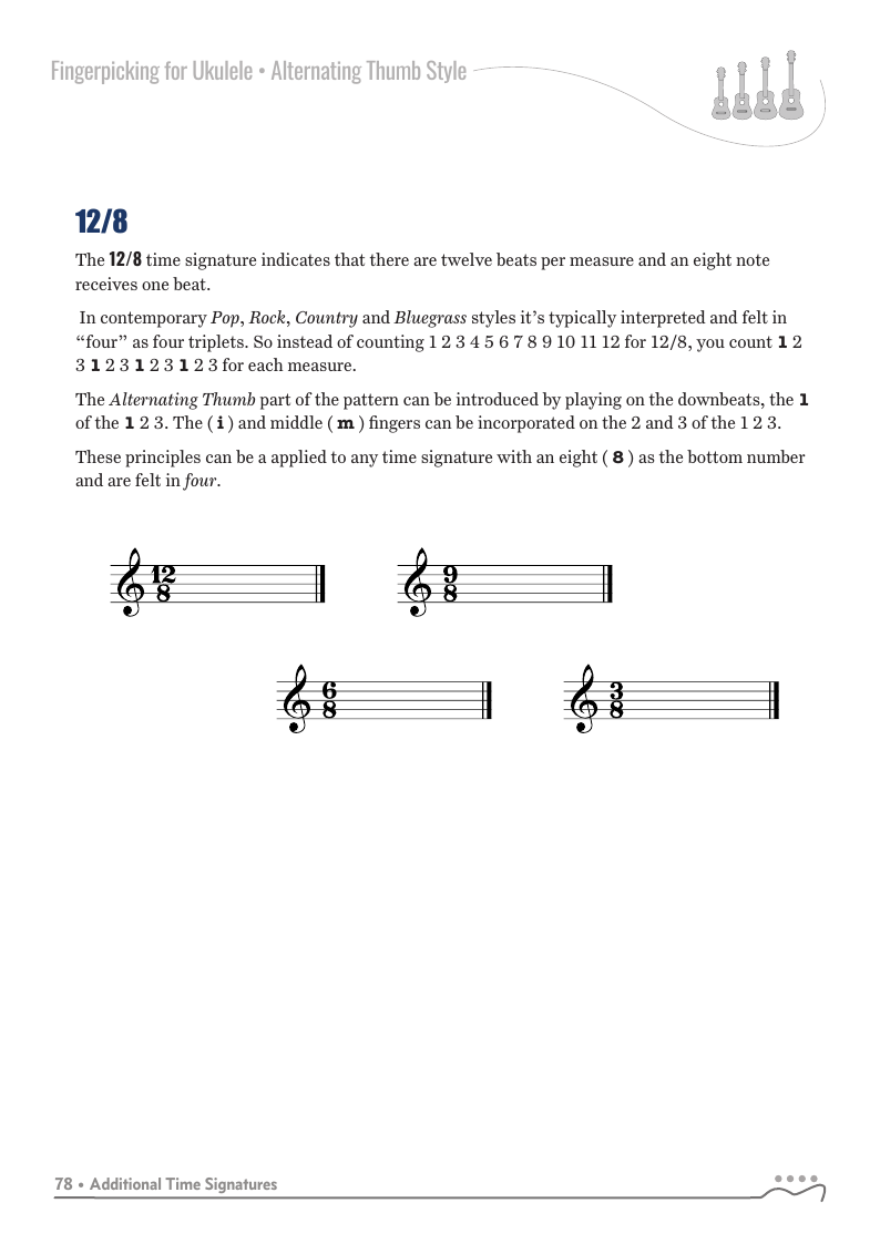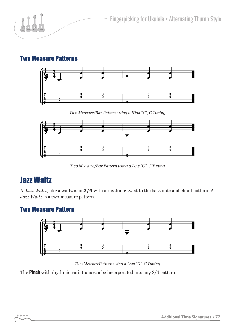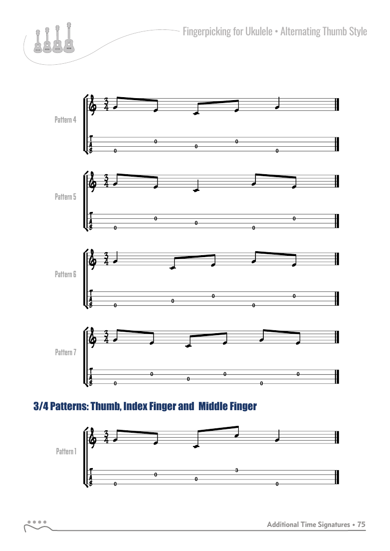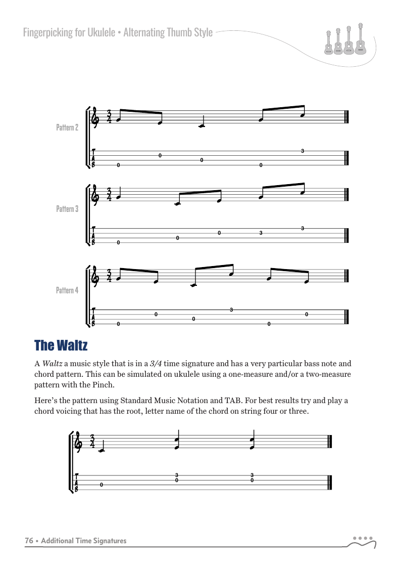 The patterns in the previous chapters were all in 4/4, common time with four beats per measure or pattern. The alternating thumb fingerpicking style can be used with additional time signatures.