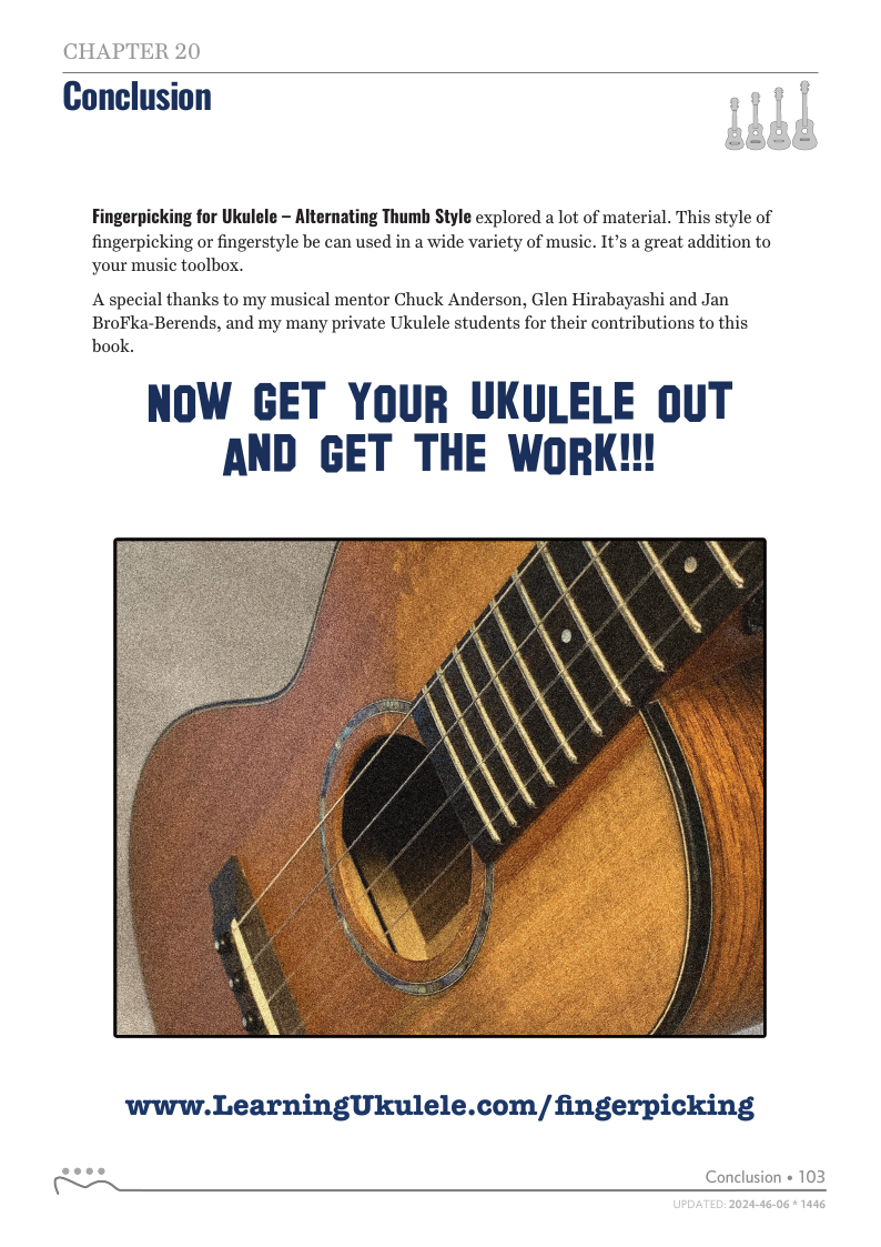 Fingerpicking for Ukulele – Alternating Thumb Style explored a lot of material. This style of fingerpicking or fingerstyle be can used in a wide variety of music. It’s a great addition to your music toolbox. A special thanks to my musical mentor Chuck Anderson, Glen Hirabayashi and Jan BroFka-Berends for their contributions to this book.