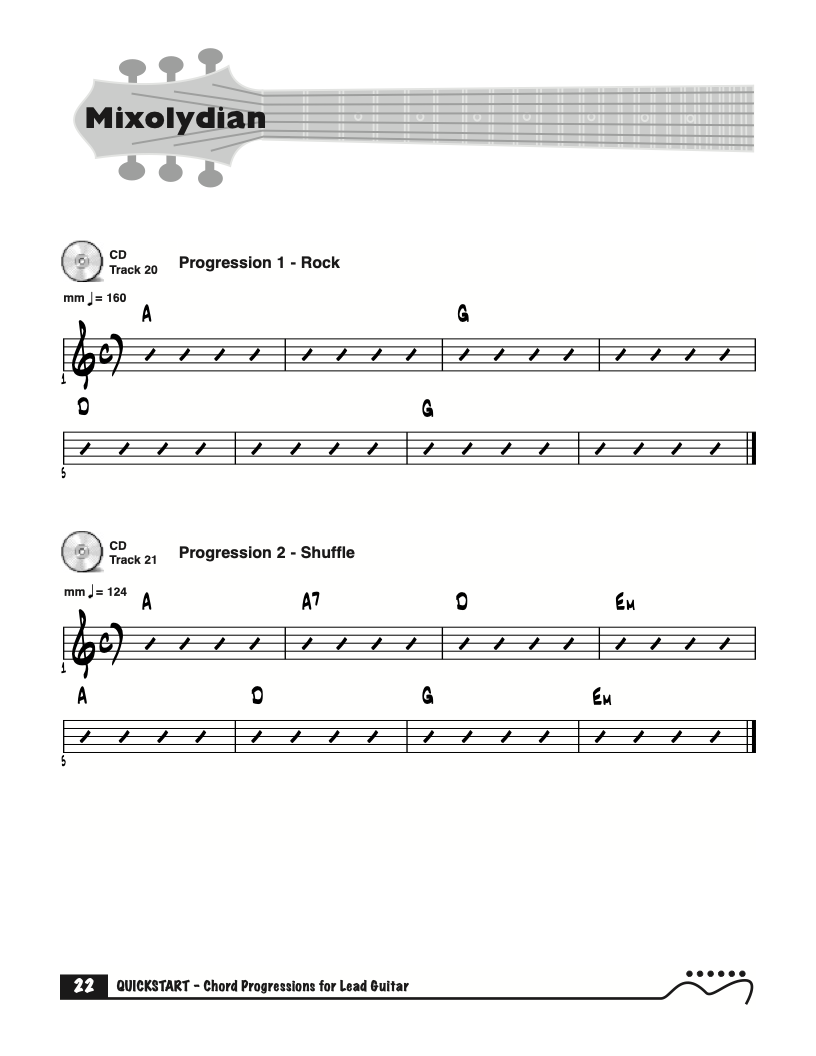 The QuickStart Mixolydian Play-along Tracks play-along tracks from the QuickStart Chord Progressions for Lead Guitar. These tracks are suitable for any instruments. The Mixolydian scale is also known by it's traditional name: Dominant.