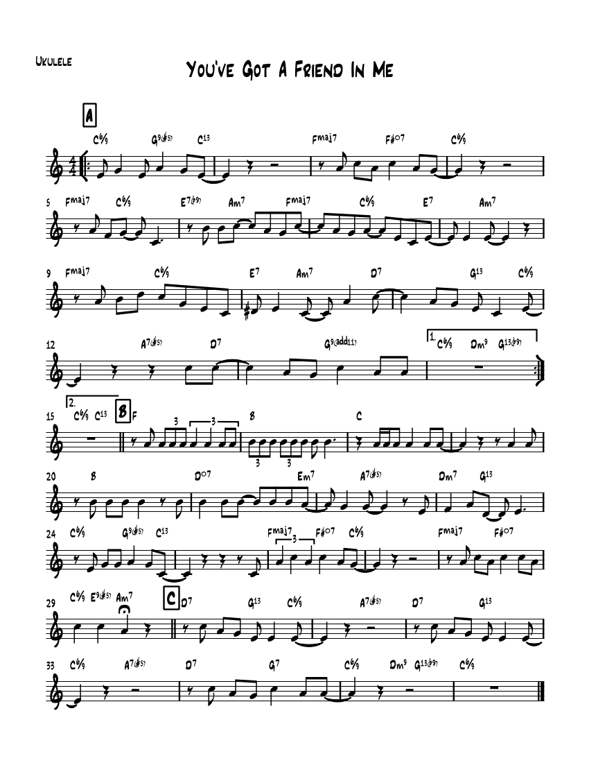 Leadsheet with Ukulele chords for "You've Got a Friend in Me" by Randy Newman.
