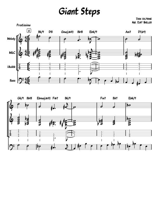 Giant Steps — Solo Ukulele Arrangement - Leadsheet with Ukulele TAB and one chorus of Paul Chambers bass line from the original recording.