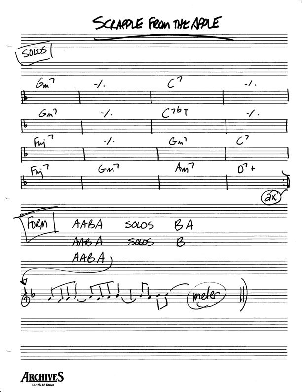 "Scrapple From The Apple" is a bebop tune written by the great pioneer of bebop himself, Charlie Parker. This tune borrows the changes of “Honeysuckle Rose” for the A section and “I Got Rhythm” changes for the B section.