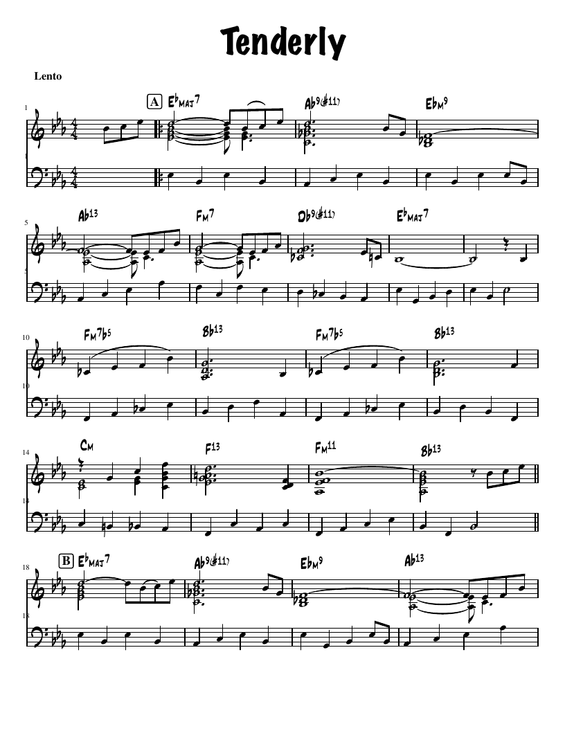 "Tenderly" is a popular song published in 1946 with music by Walter Gross and lyrics by Jack Lawrence. Written in the key of E♭ as a waltz in 3/4 time, it has since been performed in 4/4 and has become a popular jazz standard.