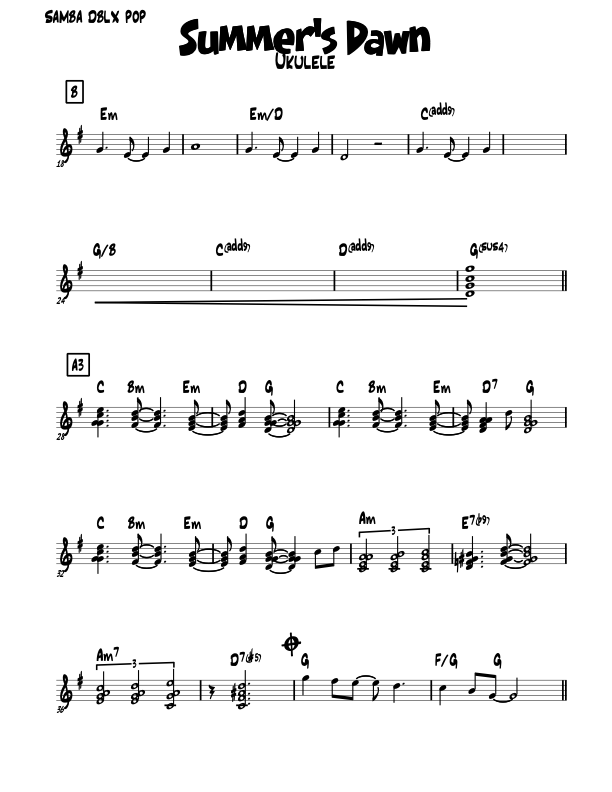 Summer's Dawn started out as an exercies in exploring harmonized major scale using triads on strings ① ② ③ of the ukulele.
