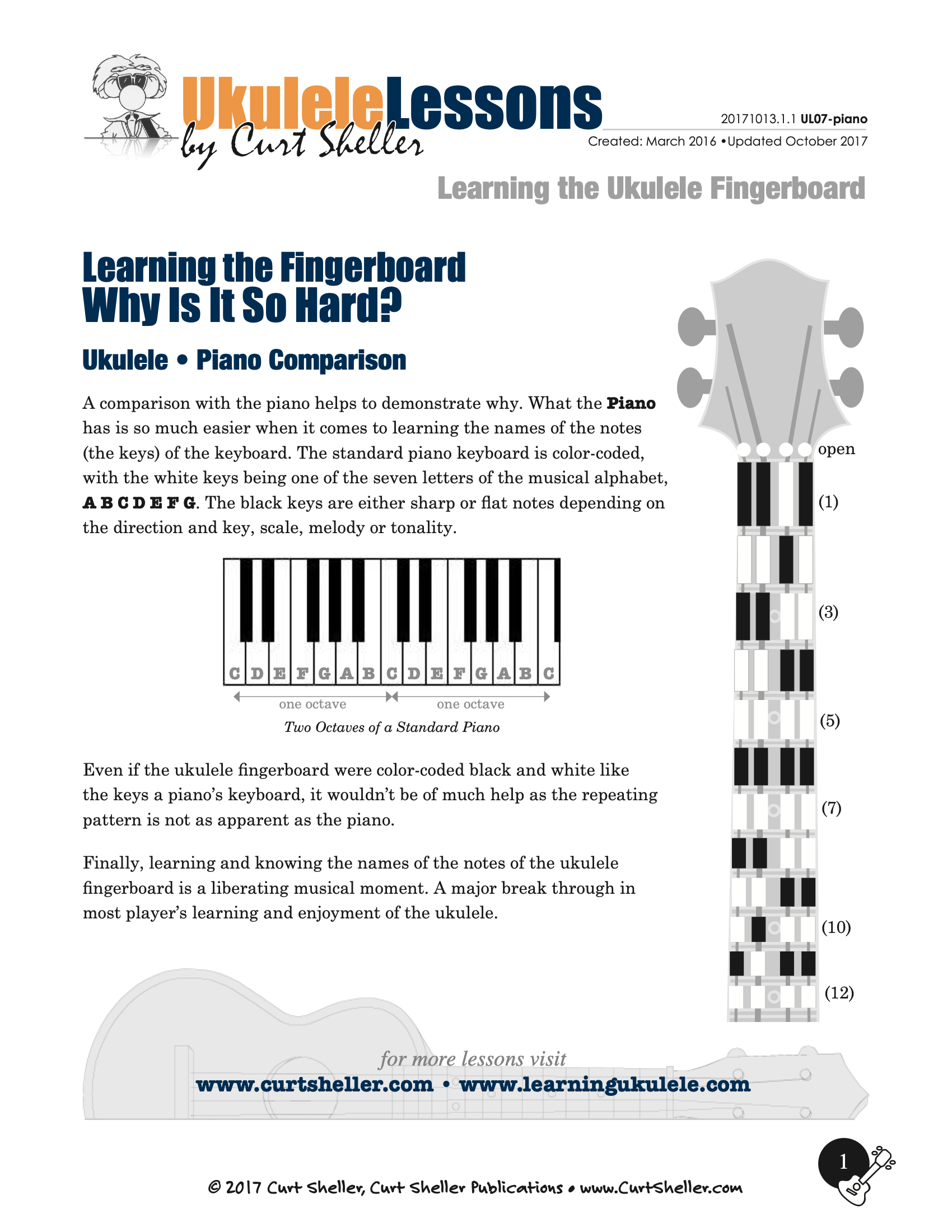 Learning the Ukulele Fingerboard — It is astonishing that on any other instrument it would be silly and not accepted to not know the names of the notes and where they are on your own instrument. But — on the ukulele, guitar and most fretted instruments their players do not know the names intuitively — they can figure them out but that takes way too long. Granted it's not as easy as the piano where higher and lower notes move in one direction only, are color coded and even at different heights. Anyone after the first or second lesson can instantly name any key on the piano.